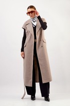 Жилет выполнен из джинсовой ткани голубого цвета без подклада. Воротник отложной. Верх изделия отрезной - кокетка сзади, кокетка спереди. По низу отрезная планка-пояс, на поясе хлястик с кнопкой. Застёжка в изделии центральная - кнопки. На уровне линии груди функциональные карманы с клапаном. Длина спинки 69 см