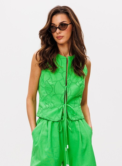 Жилет из ажурного шитья полуприлегающего силуэта без рукавов. Полочка с центральной застежкой на завязки и крючок, с 2-мя вертикальными вытачками от низа для лучшего прилегания изделия. Спинка с вертикальной вытачкой от низа и центральным швом. Жилет на подкладке из хлопка.