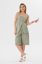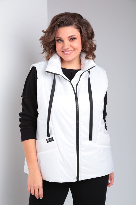Жилетка женская утепленная с центральной застежкой на "молнию". Спинка со стяжкой. Перед с отрезными бочками и боковыми карманами "с листочкой". Воротник стойка с кулисой и шнуром из декорированной тесьмы. Низ жилетки округлой формы спереди короче, а спинка длиннее . Правый карман украшен нашивкой.