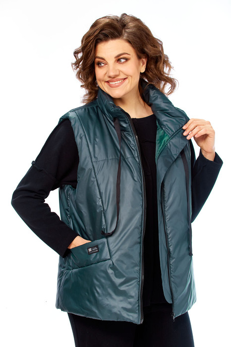 Жилетка женская утепленная с центральной застежкой на "молнию". Спинка со стяжкой. Перед с отрезными бочками и боковыми карманами "с листочкой". Воротник стойка с кулисой и шнуром из декорированной тесьмы. Низ жилетки округлой формы спереди короче, а спинка длиннее . Правый карман украшен нашивкой.