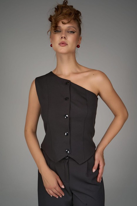 Жилет на одно плечо — смелый акцент коллекции. Нестандартный крой превращает классическую деталь гардероба в модное высказывание. Ассиметричная линия делает образ современным и запоминающимся, подчеркивая изящность фигуры и утончённый вкус.