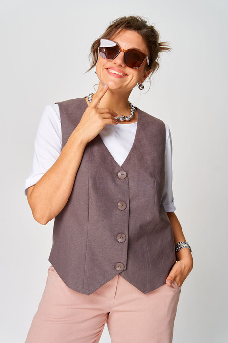 Когда хочется выглядеть стильно, не теряя в удобстве, этот жилет становится идеальным решением. Мягкий оттенок тауп идеально подчёркивает свежесть светлых базовых вещей, а приталенный силуэт с V-образным вырезом делает образ женственным и стройным. С ним легко создавать уверенные образы, которые подойдут как для деловых встреч, так и для неспешных прогулок по городу.