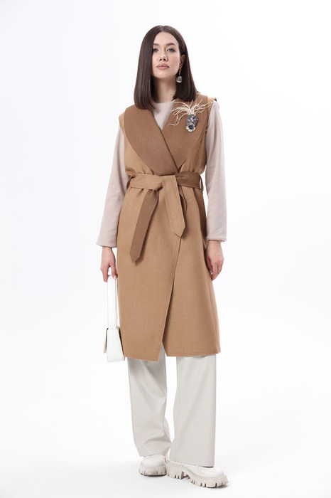Удлиненный жилет из мягкой двухсторонней шерстяной ткани  высшего качества станет универсальным акцентом вашего гардероба. Цельнокроеный воротник «апаш». Спинка цельная, перед с нагрудными вытачками и рельефами, выходящими из пройм. В рельефах переда расположены функциональные карманы. По боковым швам на уровне линии талии прикреплены 2 шлевки для протяжки пояса. Пояс из основной ткани идёт в комплекте. Брошь ручной работы на лацкане воротника - это гарантированная уникальность и всегда актуальный тренд.  Рост фотомодели 175 см. Размер у фотомодели – 44.                                        СОВЕТ ОТ СТИЛИСТА: жилет отлично визуально вытягивает рост. Жилет будет идеально смотреться, если накинуть его поверх блузки и прямых классических брюк, обувь: ботильны или лодочки на среднем каблуке.