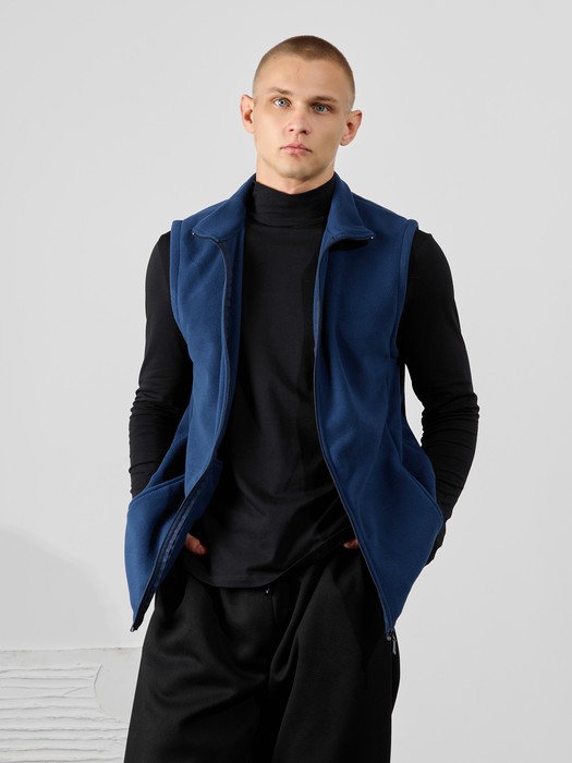 Жилет мужской из флиса, прилегающего силуэта, с воротником-стойкой , центральной боротовой застежкой на тесьму "молния" и вертикальными рельефами на полочках, в швах которых обработаны карманы. Проймы и низ изделия обработаны подгибкой. В нижней части левого бокового шва вставлен небольшой декоративный элемент из репсовой ленты.