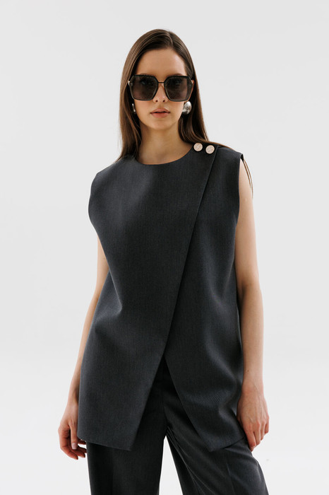 Жилет назапах с полукруглым вырезом. Застёжка на петли и пуговицы на уровне плечевого шва.