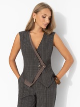 Жилет однобортный прямого силуэта с застежкой на петлю и пуговицу. Воротник стояче-отложной с отрезной стойкой с лацканами.Изделие с отрезным бочком. Перед с талиевыми вытачками, с прорезными карманами в рамку с клапанами. Край борта со скруглением по низу. Спинка со средним швом, в котором обработана шлица. Изделие на подкладке.