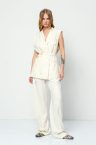 Жилет однобортный прямого силуэта с застежкой на петлю и пуговицу. Воротник стояче-отложной с отрезной стойкой с лацканами.Изделие с отрезным бочком. Перед с талиевыми вытачками, с прорезными карманами в рамку с клапанами. Край борта со скруглением по низу. Спинка со средним швом, в котором обработана шлица. Изделие на подкладке.