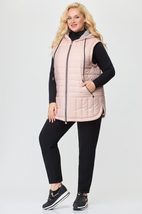 Жилет женский стеганый, прямого силуэта с капюшоном, застежкой на молнию, кокетками и подрезами по переду и спинке, прорезными карманами на молнии, на подкладке. Утеплитель синтепон.
