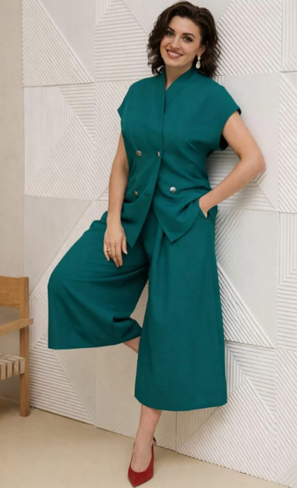 Бренд белорусской женской Anastasia представляет костюм двойку. Костюм женский 2-х предметный (жилет, юбка-брюки) из костюмной ткани станет отличным дополнением к Вашему гардеробу. Подойдет для повседневной носки (работа, офис, прогулки). Достаточно дополнить его соответствующими предметами из вашего гардероба: блузка, майка, водолазка, гольф, свитер, лонгслив, свитшот. Или аксессуарами: ремешок или пояс. Жилет полуприлегающего силуэта, со спущенным плечом. Может быть самостоятельным элементом гардероба. Застежка двубортная. Воротник цельнокроеная стойка. По полочке идет грудовая выточка из бокового шва, по спинке средний шов. Трендовая юбка-брюки.