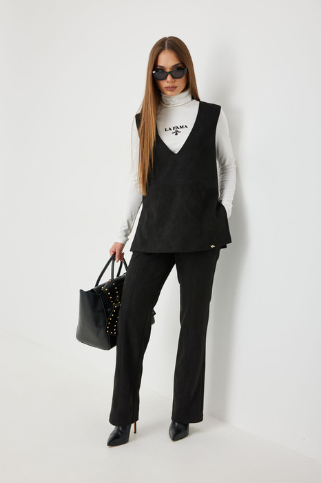 Жилет женский из ткани «под замшу» прямого силуэта на подкладке, вырез горловины глубокий V-образный,  по боковым швам разрезы, по переду и спинке горизонтальные декоративные швы. Длина 69 см.