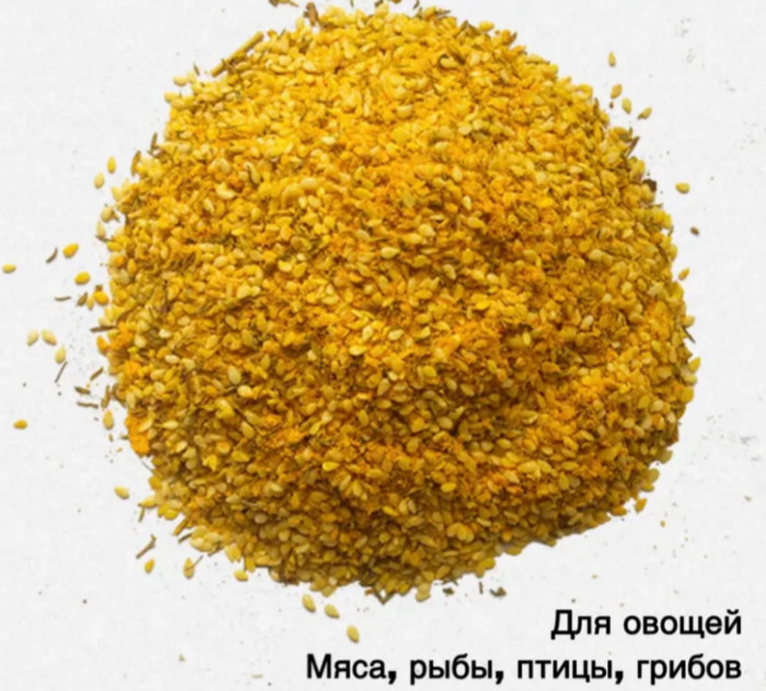 Приправа идеально подходит для салатов, рыбы, овощей, куриного и рыбного филе, для омлета. Золотистую приправу можно так же добавлять в тушёные овощи, Грибы и каши.