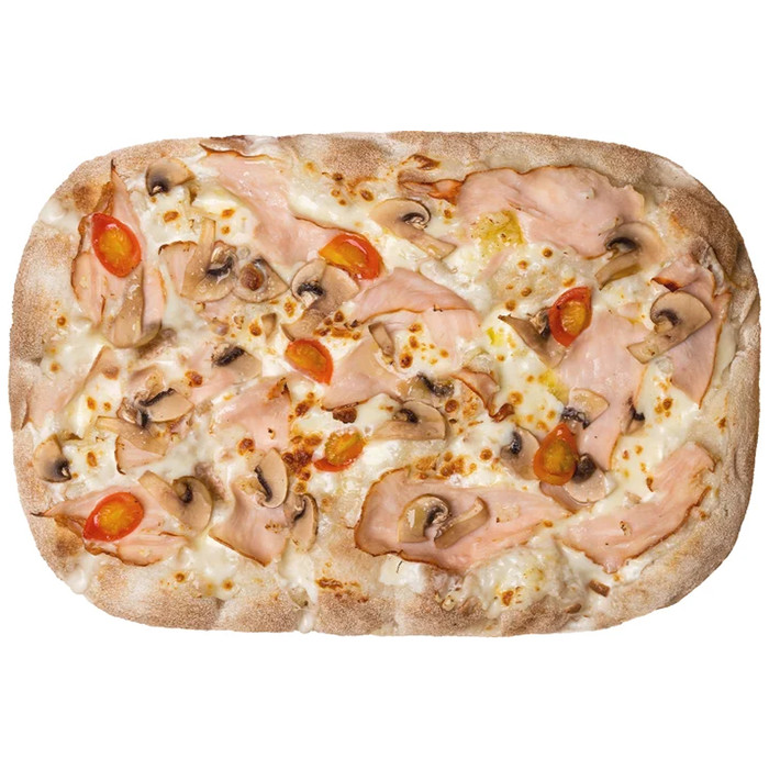 Состав: основа для пиццы отпеченная, сыр с ЗМЖ, соус сырный, напиток молокосодержащий с заменителем молочного жира м.д.ж 3,2%, продукт из мяса птицы в/к Индейка копченая, грибы шампиньоны, помидоры черри, оливковое масло, чеснок свежий, соль поваренная пищевая.