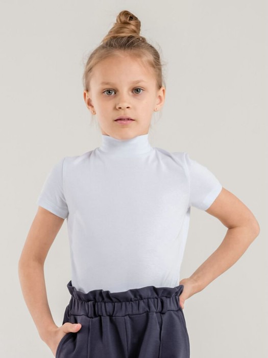 Водолазка из кулирной глади с эластаном с короткими рукавами и воротником-стойкой.