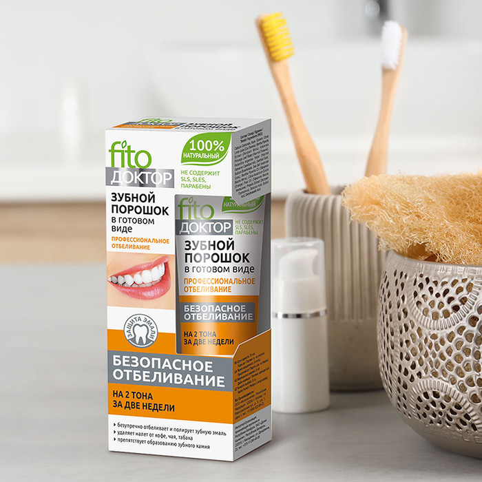 Зубной порошок в готовом виде – инновационный прорыв в сфере ухода за зубами! Уникальная рецептура порошка имеет нежную, сбалансированную консистенцию и позволят профессионально и безопасно отбелить зубы на 2 тона за две недели ежедневного применения. Зубной порошок бережно полирует и осветляет эмаль, удаляет налет от чая, кофе и табака, укрепляет зубы и десны, препятствует образованию зубного камня. Входящие в состав натуральный сок лимона, морская соль, масло апельсина и экстракт мяты обладают мощным антибактериальным действием, надежно защищают от кариеса и болезней десен, надолго освежают дыхание.
