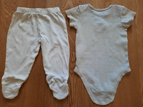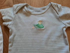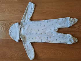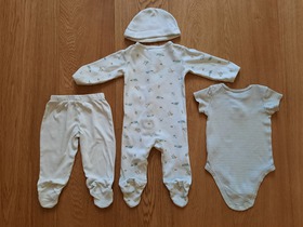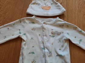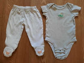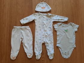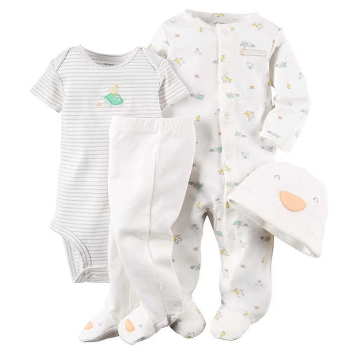 Комплект известного, американского бренда Carters, 4-Piece Take-Me-Home Set. Комплект из 4 предметов боди, слип, штаны и шапка "Очаровательный утенок". Очень интересный подарочный комплект для новорожденного из новой коллекции Carters. Комплект состоит из слипа, бодика, штанишек и шапочки. Боди и штаны подойдут малышу для активных игр, а в слипе ему будет комфортно и уютно спать. Слип нежного цвета. Боди имеет удобные запахи и внизу застегивается на удобные кнопки для быстрой смены подгузника. Слип застегивается по всей длине на удобные кнопки и имеет закрытые ножки. Шапочка украшена смешной мордочкой, а штаны имеют чудесные ножки - мордочки. Совершенно необходимый комплект в любое время года! Отличный подарок для новорожденного малыша! Отлично подойдет как для девочки, так и для мальчика. Термо - этикетка, не царапает кожу малыша. Кнопки не содержат опасного для кожи ребенка Никеля. Усиленное основание для кнопок. Цвет: Multi. Состав: 100% хлопок. Размер: 6M для мальчика 6 месяцев, ростом 61-69 см, весом 5.7-7.5 кг. Состояние: б/у, у комбинезона, штанишек и шапочки отличное; у бодика удовлетворительное (есть еле заметные пятна на лицевой стороне, подойдет для самостоятельного потребления пищи).