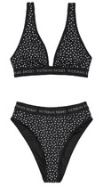 Новый, оригинальный купальник бикини известного, американского бренда VICTORIAS SECRET, Sydney Logo Plunge Swim Top & Logo High Waist Cheeky Swim Bottom. Купальный топ с глубоким вырезом и логотипом. Окунитесь в спортивный стиль с этим верхом бикини с глубоким вырезом, который переходит в полосу (ленту) с логотипом. Съемная подкладка пуш-ап. Комфортные плавки с высокой талией в спортивном стиле. Благодаря классическому поясу (ленты) с логотипом достигается минимальное покрытие спины. Цвет: 58LG Black White Dot. Состав верха: основная часть: 80% полиамид, 20% эластан; подкладка: 92% полиэстер, 8% эластан. Состав низа: основная часть: 80% полиамид, 20% эластан; подкладка: 92% полиэстер, 8 % эластан. Размеры: верх XS, сша 32AA 32A 32B, наш 70АА 70А 70В, низ XS.