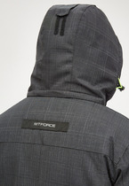 Горнолыжная мужская куртка имеет съемный капюшон на молнии и два фиксатора по бокам. Верх капюшона с фиксатором, регулирующим глубину. Два нагрудных кармана, правый прикрыт ветрозащитной планкой. Два накладных кармана с потайным прорезным на молнии. Манжеты рукавов на регулируемых липучках с эластичными вставками с прорезью для пальца. Ушки капюшона фиксируются липучками и кнопкой и закрыты планкой. На воротнике курки шита ткань для защиты от натирания шеи и подбородка. На груди с правой стороны, на левом рукаве (в районе предплечья) фирменный логотип MTFORCE. Внутренняя часть куртки от плеча до пояса имеет систему omni-heat с фирменным логотипом компании, также подкладка спины выполнена из дышащего материала для улучшения циркуляции воздуха. Внутри имеется два накладных кармана из сетки. С внутренней стороны изделия имеется держатель для наушников, а также, дополнительный боковой карман (слева) на молнии. На ярлыке с правой стороны, присутствует голограмма с фирменным логотипом. Внутри рукавов материал подклад 100% полиэстер. Двойная молния имеет ветрозащитную планку на липучках и кнопках. Есть крючок-держатель.