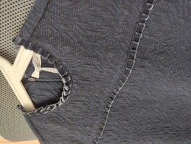 Материал- костюмный трикотаж, держащий форму. Цвет тёмно-синий, с вплетением нити- люрекс. Отделка кокетки, горловины и низа рукавов бархатной лентой. Застежка- молния на спинке.