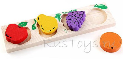 Игрушка хорошего качества с умеренным использованием цвета (сама рамка оставлена неокрашенной и несет шероховатость и запах сосны).Игрушка из ряда пособий известных как "доски Сегена".На фигурки рисунок и краска нанесены методом шелкографии.Размеры доски 30х8 см, толщина доски 1,5 см.Размер отдельных фигурок, которым малыш находит нужное место на доске ориентируясь на форму пазов.Возраст: от1,5 лет