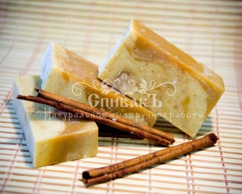 Мыло апельсин-корица сварено по специальному рецепту. В составе мыла существенную долю занимает какао-масло, благодаря чему запах мыла имеет шоколадный оттенок. Эфирное масло апельсина обладает антицеллюлитными свойствами, способствует очистке кожи от вредных веществ, повышает упругость и разглаживает кожу. В свою очередь, эфирное масло корицы обладает антисептическими свойствами, снимает воспаления.
