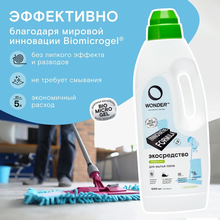Безопасное эко средство для мытья пола WONDER LAB Нейтральное 1л эффективно удаляет загрязнения с любых напольных покрытий: линолеум, ламинат, керамическая плитка, мрамор, паркет.